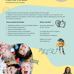 Kinder brauchen Halt, Sicherheit und das Gefühl: Ich kann das! In diesem Training lernen Kinder spielerisch, mutig zu werden, sich zu spüren, mit großen Gefühlen umzugehen und an sich zu glauben. Alles in Bewegung, mit Freude und klaren Strukturen. Was erwartet die Kinder: Selbstbewusstsein und Superkräfte stärken innere Stärke entdecken lernen mit Konflikten und Herausforderungen umzugehen Eigene Grenzen erkennen und wahren Gefühle & Bedürfnisses erkennen Bitte beachte, dass ich dir die Rechnung vorab per E-Mail zu kommen lasse.